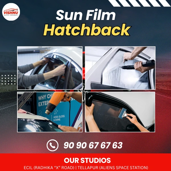 Complete RTO-legal sunfilm installation for hatchbacks—covering front, side and rear glasses. Designed to reduce heat, block UV rays and improve cabin comfort in Hyderabad traffic.