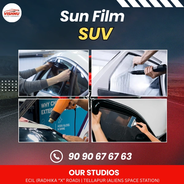Premium RTO-approved sunfilm package for SUVs and MUVs, covering front, side, and rear glasses. Offers superior heat rejection, glare control and UV protection—perfect for large cabin SUVs in Hyderabad’s hot climate.
