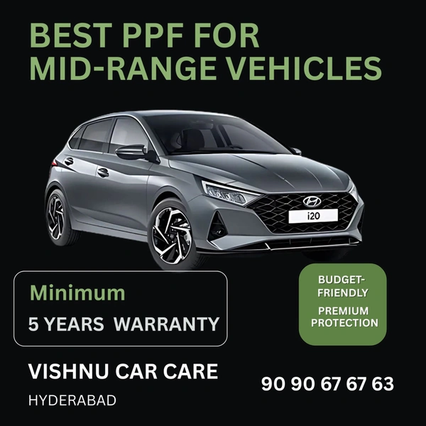 At Vishnu Car Care Hyderabad, we provide the best PPF installation for Hyundai i20. This one-time solution, backed by a 5-year warranty, protects the paint from everyday damage while retaining the car’s original look. It makes maintenance effortless—regular washes are enough to keep it looking brand new. Our PPF is trusted by Hyundai i20 owners across Hyderabad as the perfect balance of quality and affordability.