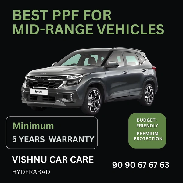 At Vishnu Car Care Hyderabad, we provide the best PPF installation for Kia Seltos. This one-time solution, backed by a 5-year warranty, protects the paint from everyday damage while retaining the car’s original look. It makes maintenance effortless—regular washes are enough to keep it looking brand new. Our PPF is trusted by Kia Seltos owners across Hyderabad as the perfect balance of quality and affordability.