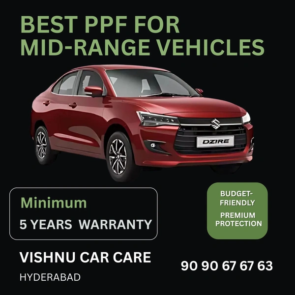 At Vishnu Car Care Hyderabad, we provide the best PPF installation for Maruti Dzire. This one-time solution, backed by a 5-year warranty, protects the paint from everyday damage while retaining the car’s original look. It makes maintenance effortless—regular washes are enough to keep it looking brand new. Our PPF is trusted by Maruti Dzire owners across Hyderabad as the perfect balance of quality and affordability.