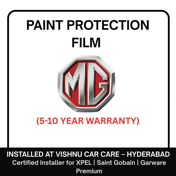 At Vishnu Car Care – Hyderabad, we specialize in Paint Protection Film (PPF) for MG vehicles: flagship SUVs like the Gloster, futuristic EVs like the Cyberster & Windsor EV, and the popular ZS EV. Every installation is registered with the manufacturer, and you receive a direct warranty mail from XPEL, Saint-Gobain or Garware Premium.