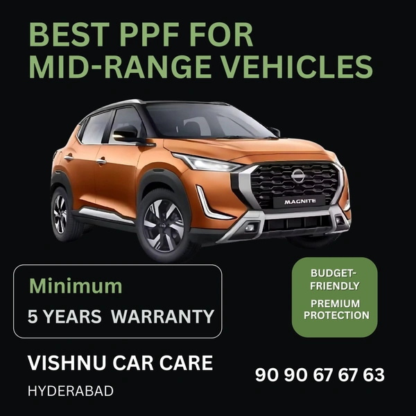 At Vishnu Car Care Hyderabad, we provide the best PPF installation for Nissan Magnite. This one-time solution, backed by a 5-year warranty, protects the paint from everyday damage while retaining the car’s original look. It makes maintenance effortless—regular washes are enough to keep it looking brand new. Our PPF is trusted by Nissan Magnite owners across Hyderabad as the perfect balance of quality and affordability.