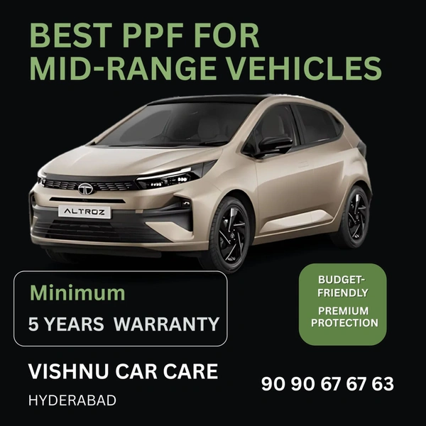 At Vishnu Car Care Hyderabad, we provide the best PPF installation for Tata Altroz. This one-time solution, backed by a 5-year warranty, protects the paint from everyday damage while retaining the car’s original look. It makes maintenance effortless—regular washes are enough to keep it looking brand new. Our PPF is trusted by Tata Altroz owners across Hyderabad as the perfect balance of quality and affordability.