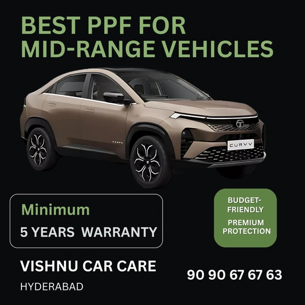 At Vishnu Car Care Hyderabad, we provide the best PPF installation for Tata Curvv. This one-time solution, backed by a 5-year warranty, protects the paint from everyday damage while retaining the car’s original look. It makes maintenance effortless—regular washes are enough to keep it looking brand new. Our PPF is trusted by Tata Curvv owners across Hyderabad as the perfect balance of quality and affordability.