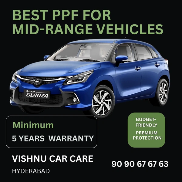 At Vishnu Car Care Hyderabad, we provide the best PPF installation for Toyota Glanza. This one-time solution, backed by a 5-year warranty, protects the paint from everyday damage while retaining the car’s original look. It makes maintenance effortless—regular washes are enough to keep it looking brand new. Our PPF is trusted by Toyota Glanza owners across Hyderabad as the perfect balance of quality and affordability.
