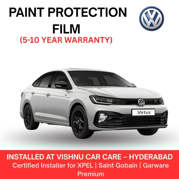 The Volkswagen Virtus GT is a sporty premium sedan, and PPF ensures its bold design stays intact. At Vishnu Car Care – Hyderabad, we install premium PPF brands (XPEL, Saint Gobain & Garware Premium), each officially registered and supported with a direct warranty mail.
